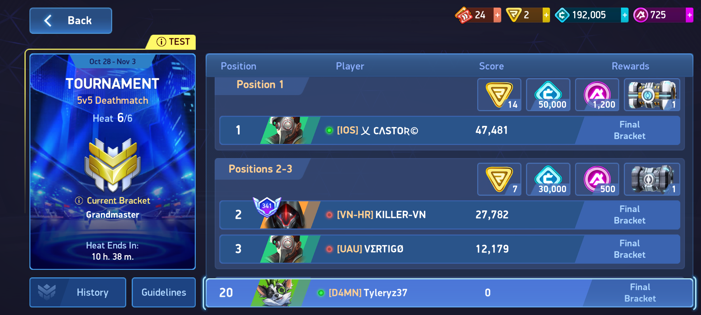 Tourney's heat is also flawed. Players are thrown into the worst possible places for them to play normally. I mean, look at poor me! Maybe, on the first battle, set the player up against bots, see their points and decide which bracket they go into, so all SP droppers(if any due to the new system) are bunchec together to fight.
