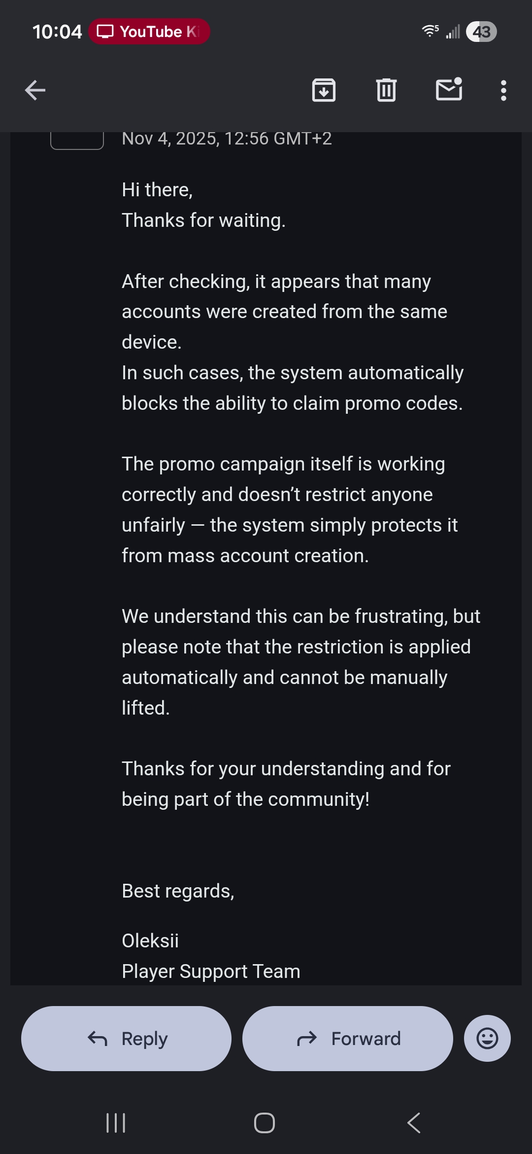 3 accounts... 1 p2w account, 1 chump change account and a f2p. They said there is no fix for the seeable future. All research I've done points to my account being red flagged by a person and not a system. They blocked all 3 accounts from using promo codes.