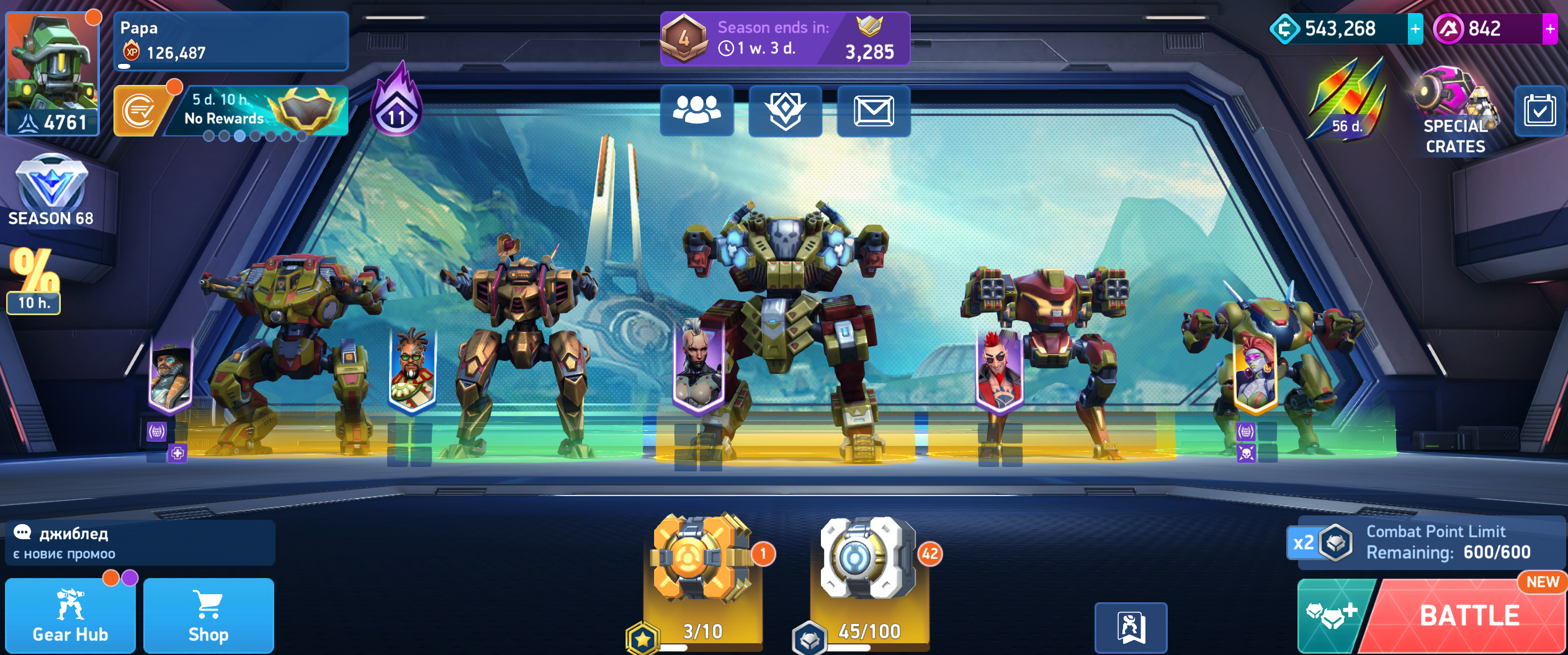 EDIT: Ok I tried to play again.. I used my strongest possible hangar.. I won and took 1st place.. Despite enemies were much higher than me in equipment.. It's weird but ok... lets say I like it after 2 battles... First one I tried with 3000 hangar and was dominated like a baby.. the second one I used 4700 hangar, it's all I have... And it was good... There were monsters in both teams but somehow didnt get that many kills as me.. and I'm not sure if one team dominated the other... I didn't feel like dominating anyone myself.. I felt like our team was a bit stronger.. just when you see that enemy lost most control points quite quickly.. it tells you that one team is OP.. but looking at players the enemies were 5000-6000 hangars.. with all sort of geminis savants and legendary mechs.. and hmm... i can play against them.. my MVP was 4 stars and the other 2 were at maximum :D whatever