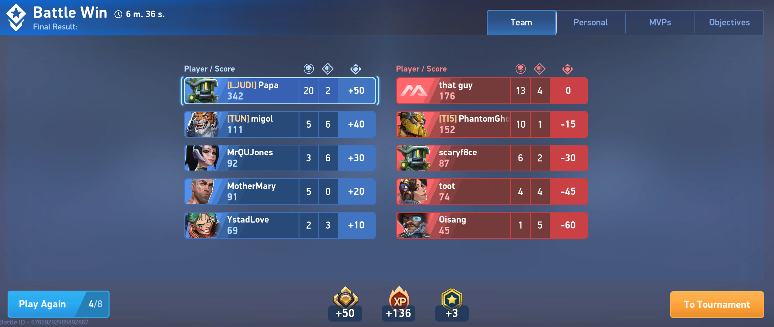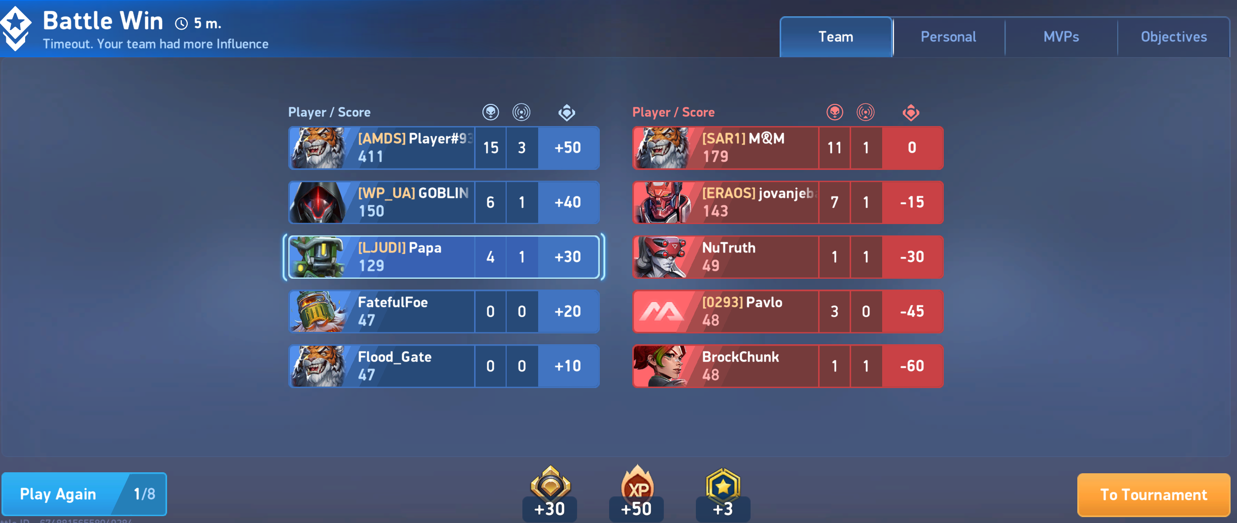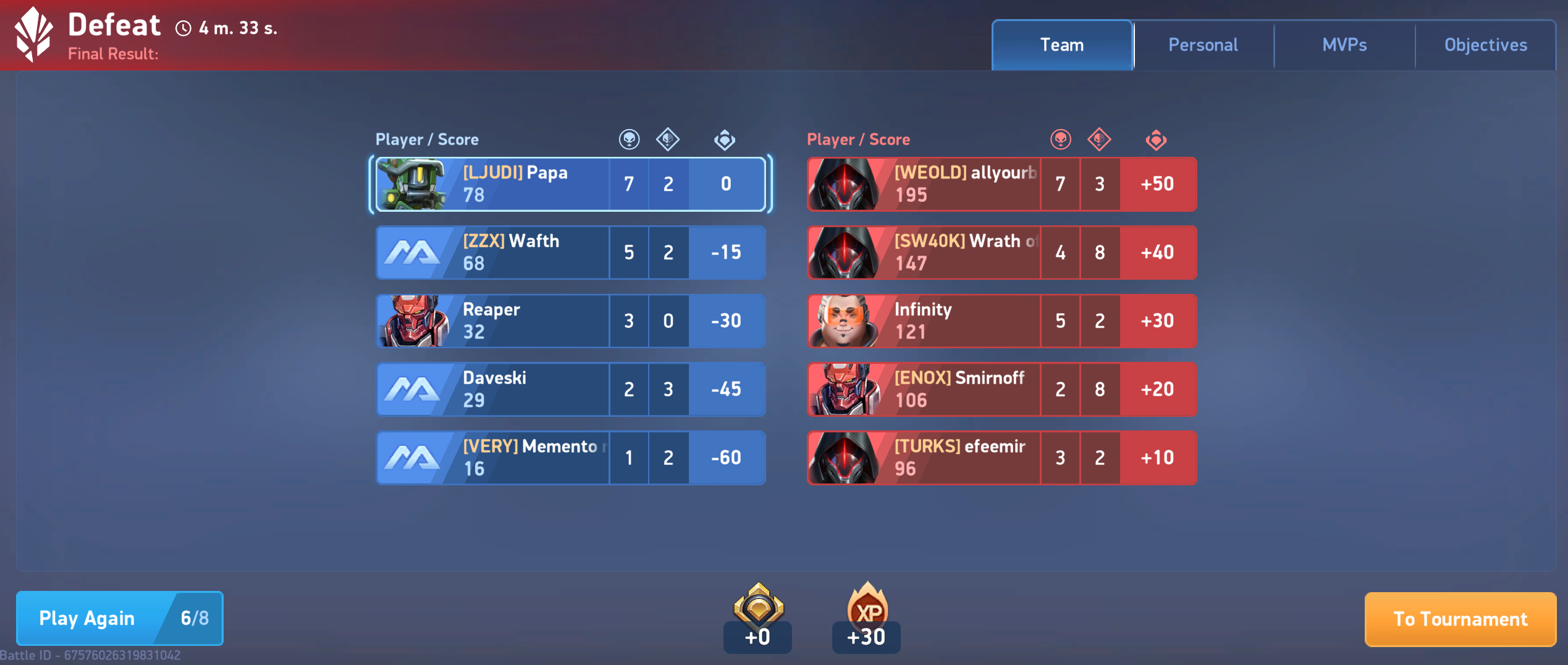 What a great tournament day today.. In all games that I lost I managed to get 0 points :) Fantastic.. What does it say about matchmaking though? Not something very positive.. And amount of bots, not very positive.. at least in FFA somehow the number of bots is very low, thats a good thing. Happy about tournaments? Rewardswise YES.. the other aspects could improve for sure..