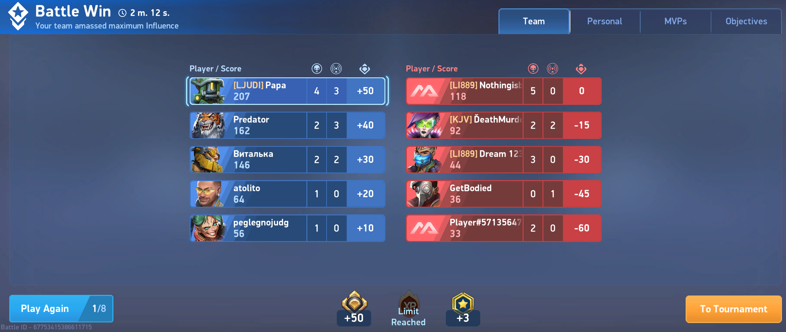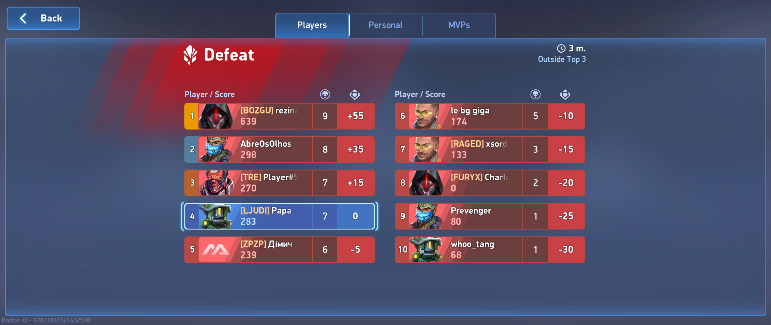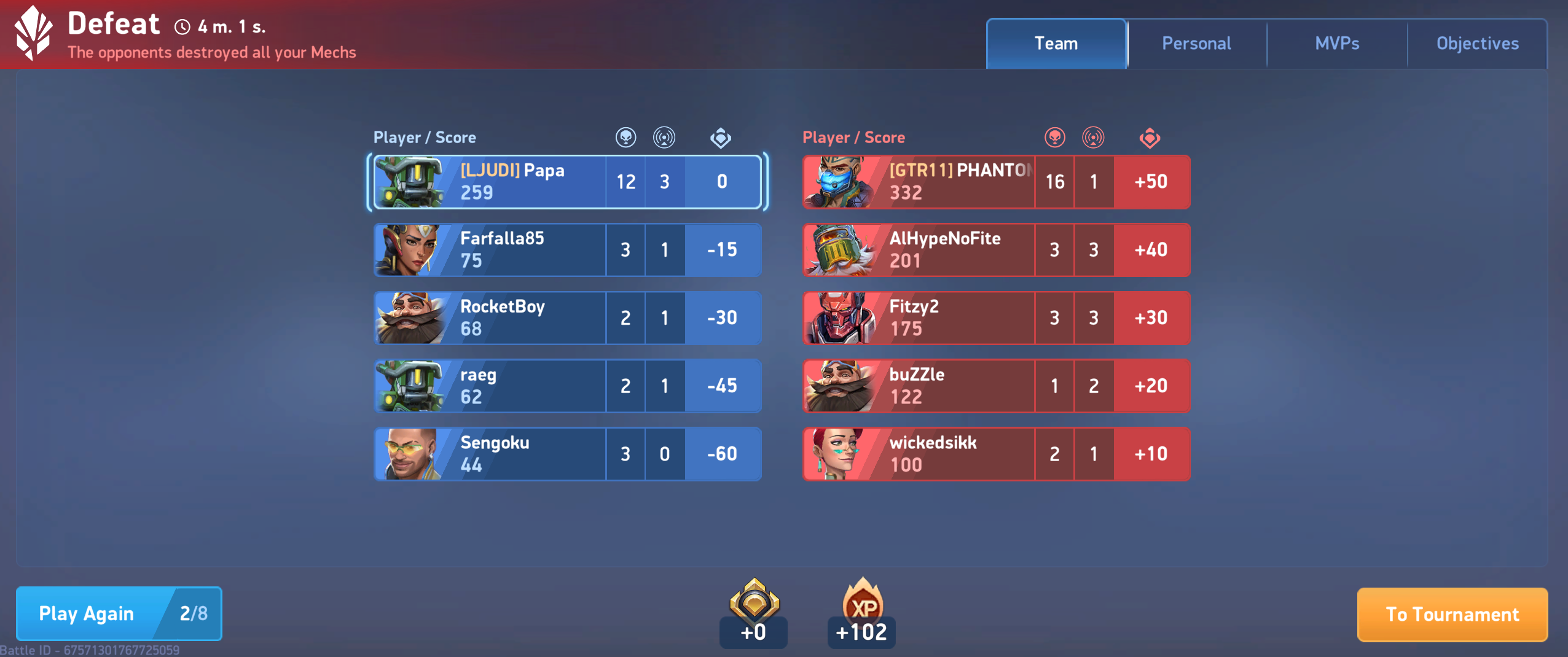 What a great tournament day today.. In all games that I lost I managed to get 0 points :) Fantastic.. What does it say about matchmaking though? Not something very positive.. And amount of bots, not very positive.. at least in FFA somehow the number of bots is very low, thats a good thing. Happy about tournaments? Rewardswise YES.. the other aspects could improve for sure..