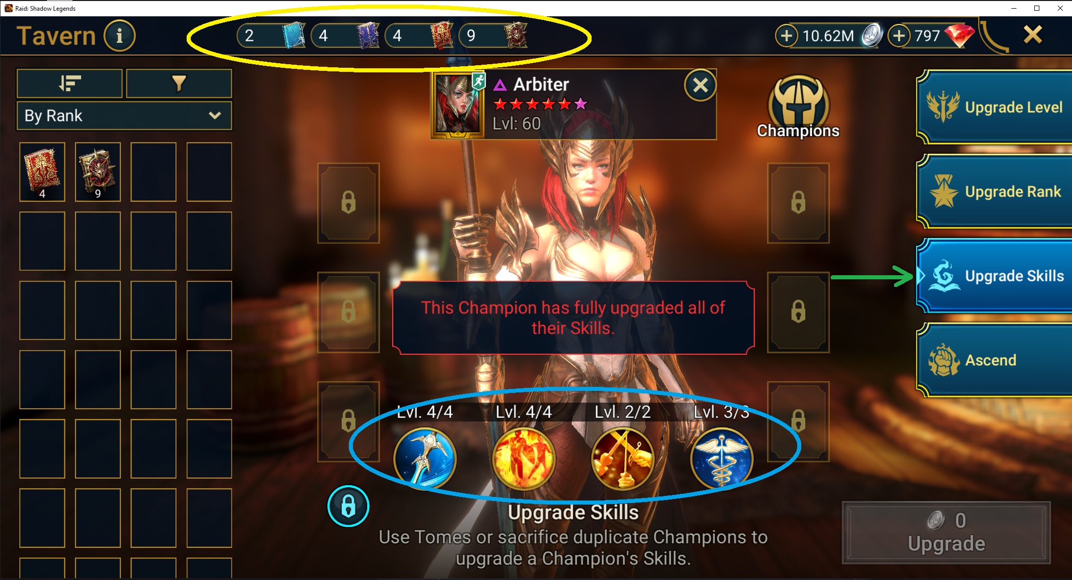 For my Arbiter here; basically you go into the tavern and select "Upgrade Skills" (green arrow) from the options. Since she is a legendary champ, you can select either Legend or Mythic books (yellow circle) to upgrade her skills. Her skills and their levels (blue circle) show at what level they are currently at.