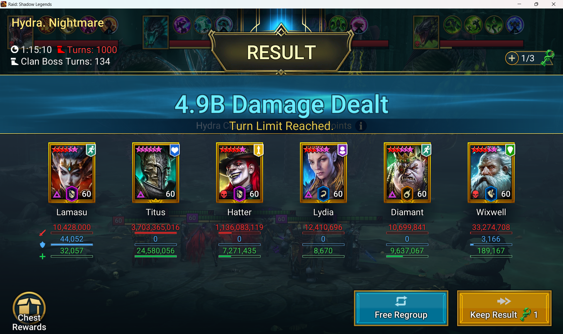 I have Lamasu in 6 pcs of Impulse and Wixwell in Reflex to cycle their skills faster. I have a shield set on Diamant with 90K HP and a Volcardiac Heart on Hatter with 93K HP. Lydia is just in standard gear. If I regeared her to 9 pcs Protection or Feral, I could get more damage out of Titus. Titus is in 7 pcs Merciless for the Ignore Defense. If I can ever get him a good set of 9, I will try it but the extra turns could let him out-run his buffs, which already happens sometimes with Lamasu hitting him with her A3s.