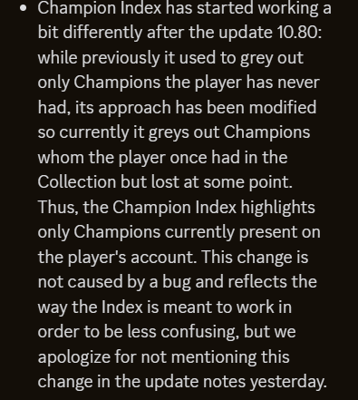 There are Champions i swear i had unlocked on my Account and they are not unlocked in Index. How i know now which Champs i already had? I do not have those Champs in my Collection at the time cause i used them probably as Chicken but im 100% sure i pulled all commons an uncommons (i'm Lev 81) and they're still not appearing in the Index. Same with Rares, i didn't check the Epics and higher rarerities. EDIT: Is there any Update to the Index i missed?