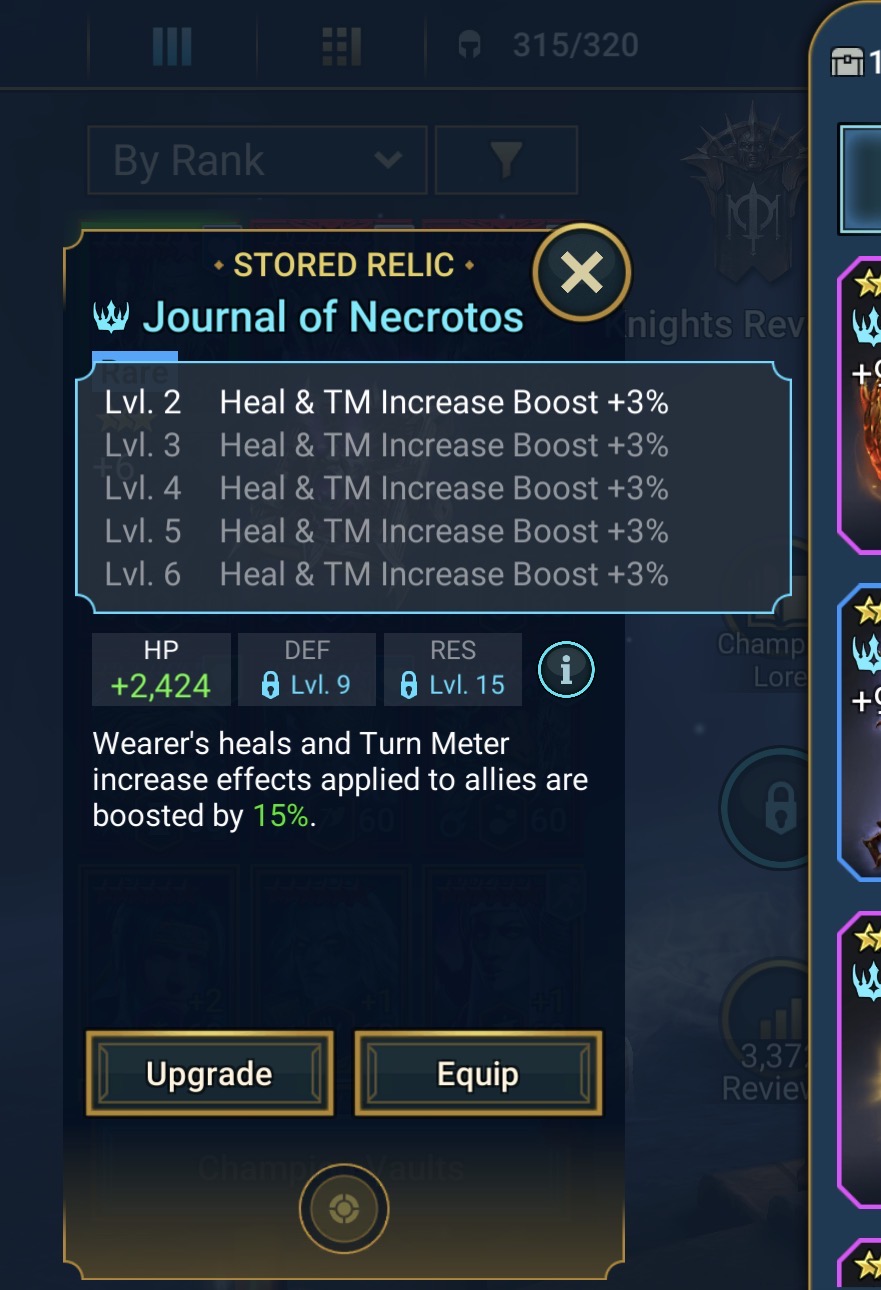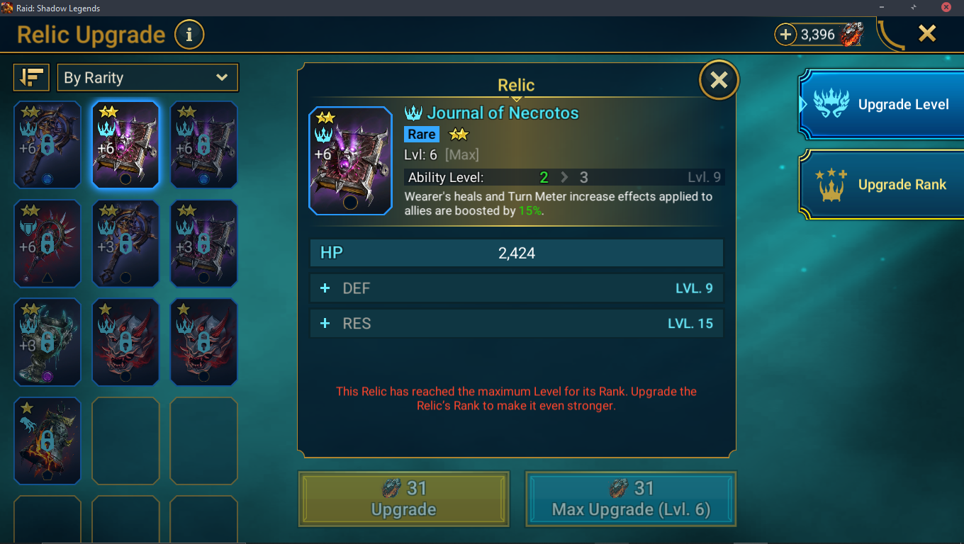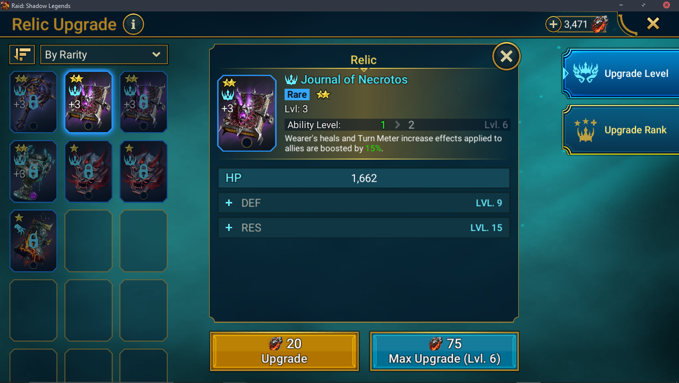 Step 2: Fully Upgade relic to increase ability level (from 1 to 2, or 2 to 3)