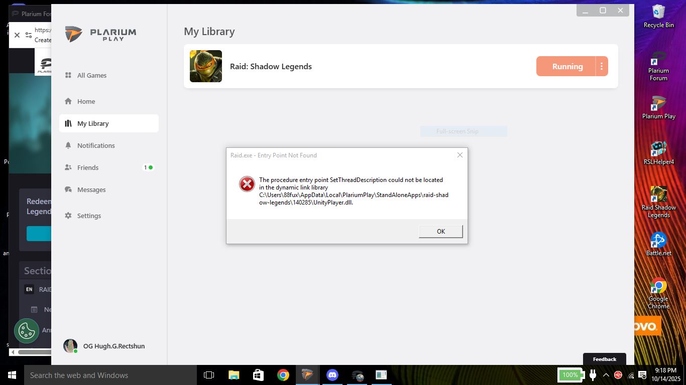 Basically it's exactly how it sounds, When i took a break from raid (on my laptop) a couple months ago, everything worked fine, plarium play, raid, RSL helper and HellHades helper app, anyway i get to itch to use my laptop to farm, and i update, Everything else works fine after updating but solely Raid isnt working, I've tried everything, i uninstalled everything, cleared plariums cache, restarted, fresh installed, same error, i'm on window 10, i added a screensnip of my screen to show raid.exe - Entry Point Not Found beause honestly i'm just at my wits end on this one guys so really any help is genuinly much appreciated.