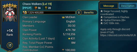 Since we’ve mastered Clashes, we’re PvP-focused and looking for players with strong PvP rosters to bolster our Siege. We’re especially looking for members who are eager to communicate on Discord — and who enjoy Siege as much as we do.