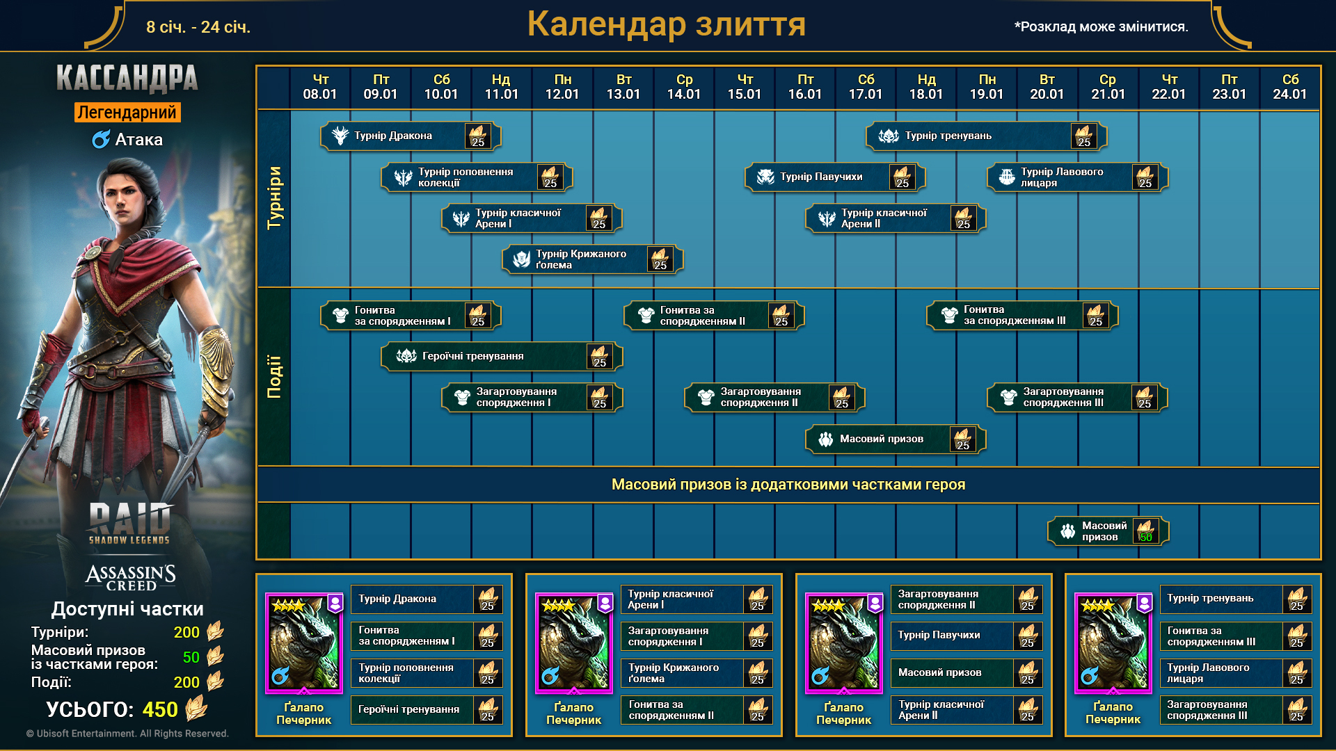 У межах співпраці RAID та Assassin's Creed у грі відбудеться особлива подія злиття. З 8 до 24 січня ти матимеш змогу створити першу героїню з нової фракції Аргонітів – Кассандру. Щоб її отримати, тобі знадобляться чотири Ґалапо Печерники.