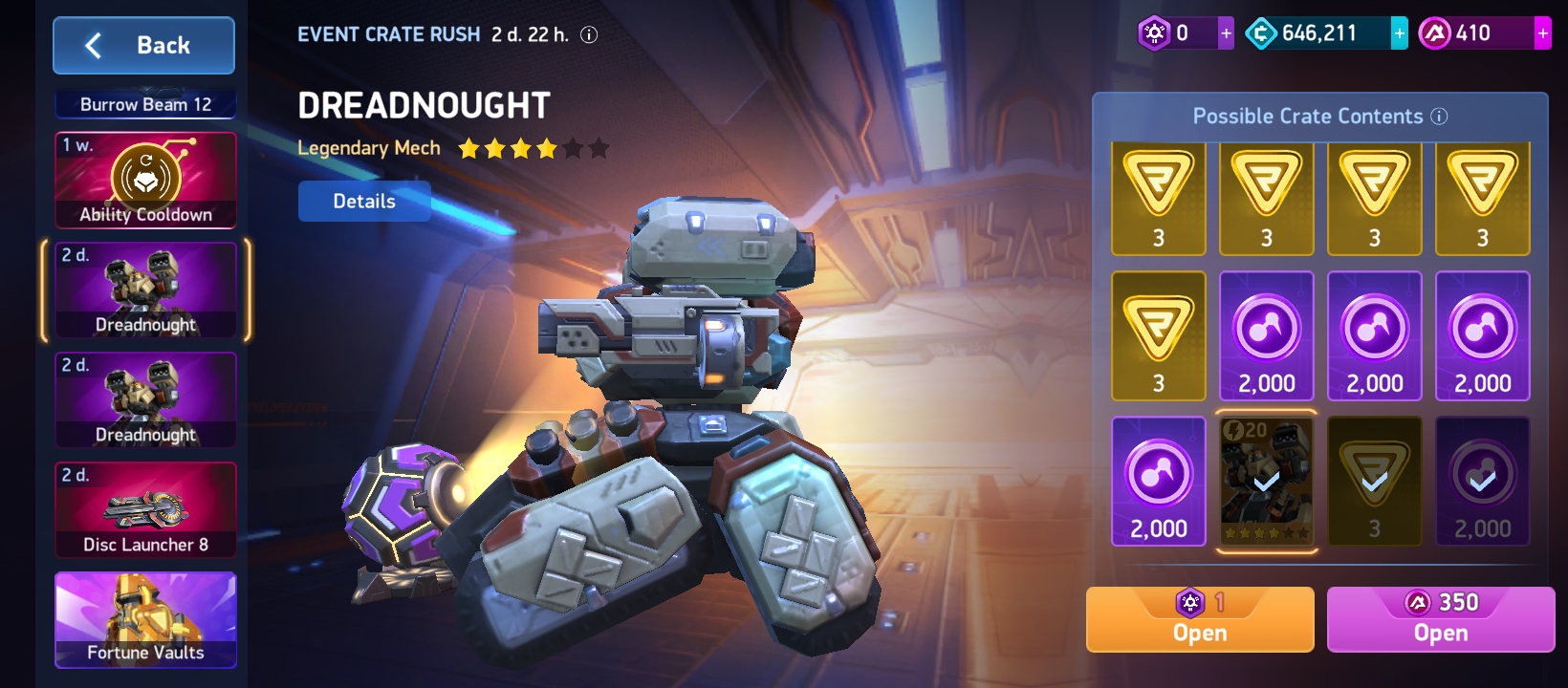 Here I got Dreadnought on the third, In some cases I forgot to screenshot and some of them r lost but still I believe it's more than enough, This is my new account, I played MA back when it was an early access when there were only 3 legendary mechs -Redox, Surge and Brickhouse, Back then new players had to struggle really hard to compete with those who started playing early, But now I haven't even maxed out my XP yet I have 10 Legendary mechs, (9 from the very same ECRs and 1 from Promo), U can check out my account if u want to