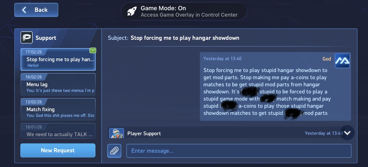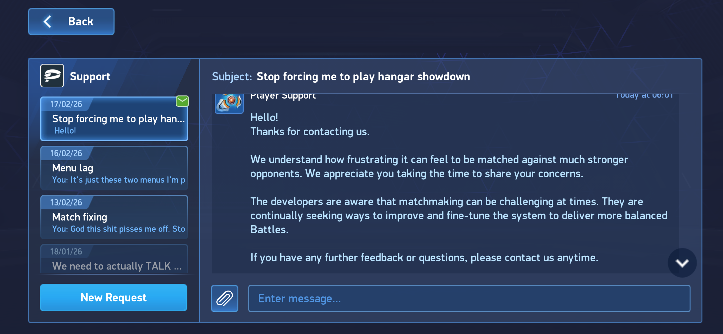 As you can see, the response doesn't match the complaint at all. This is the generic response they give to matchmaking complaints. Obviously my complaint here isn't just about match making though it was mentioned. No my complaint is about being forced to play hangar showdown.