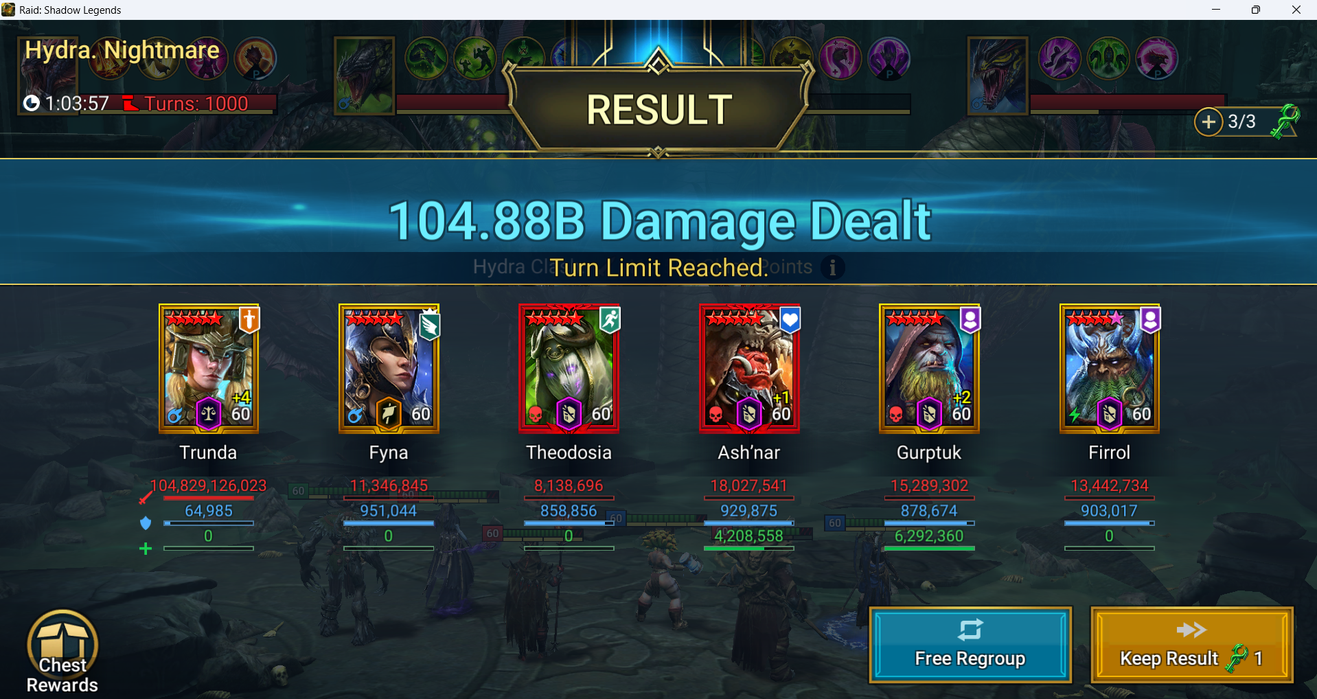 Now to Trunda. Trunda was rebalanced, but it is very hard to call it a "nerf" with a straight face.  That whole thing was an utter fiasco demonstrating (again) the incompetence of the Plarium Devs. They succeeded in hard-nerfing the Wixica alternative to Trunda, but Trunda Hydra Teams merely became marginally harder to build for big damage, while remaining the clear-cut OP Hydra Comp.  No other teams were even close, and the peeps with the mega-Trunda Teams were totally unfazed, with some of them putting up even bigger scores than before.