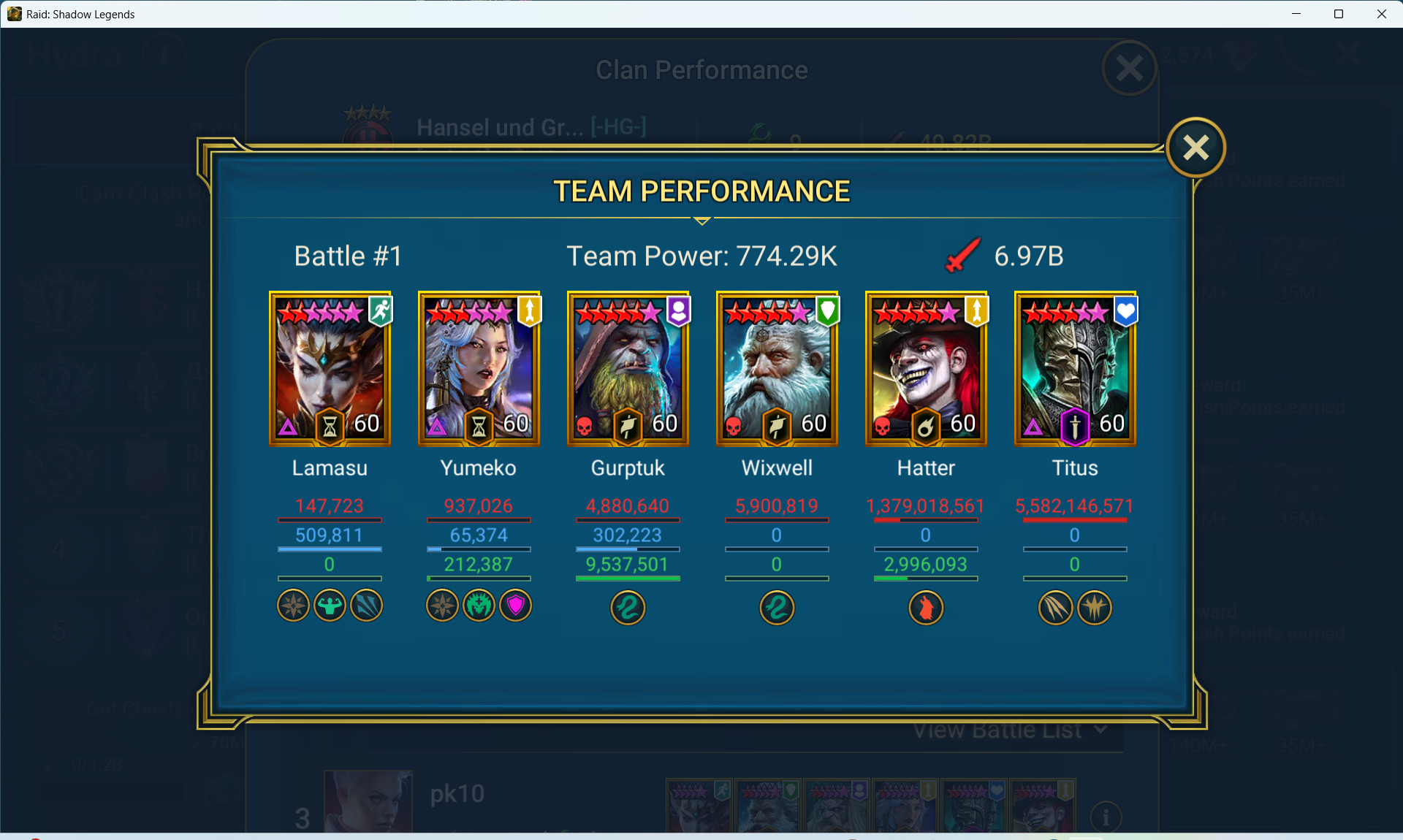 i think our clan hydra clash score was around 234b, we took second, we also do tank weeks as well