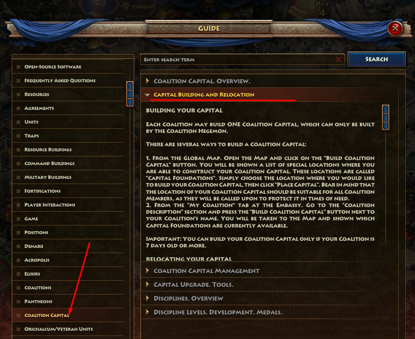 Katerina MaurogenousModeratorNov 25, 2025, 18:593 days01/31/18693Hello. Sorry for the late reply. You can open the guide to read what you need about the ingame features. Please check my sceenshot. Keep in mind that only the hegemon can start a capital, even if the hegemon is the only member of the coalition. i