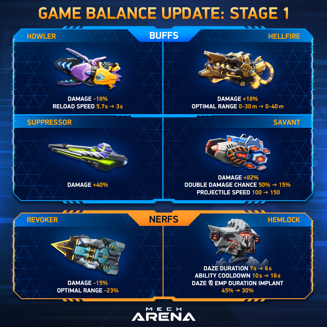 🆕👉 Today marks the first stage of our planned rebalancing of Mech Arena. We’re making these changes to smooth out the current power gaps, create a more engaging experience, and ensure a dynamic, skill-based meta.
