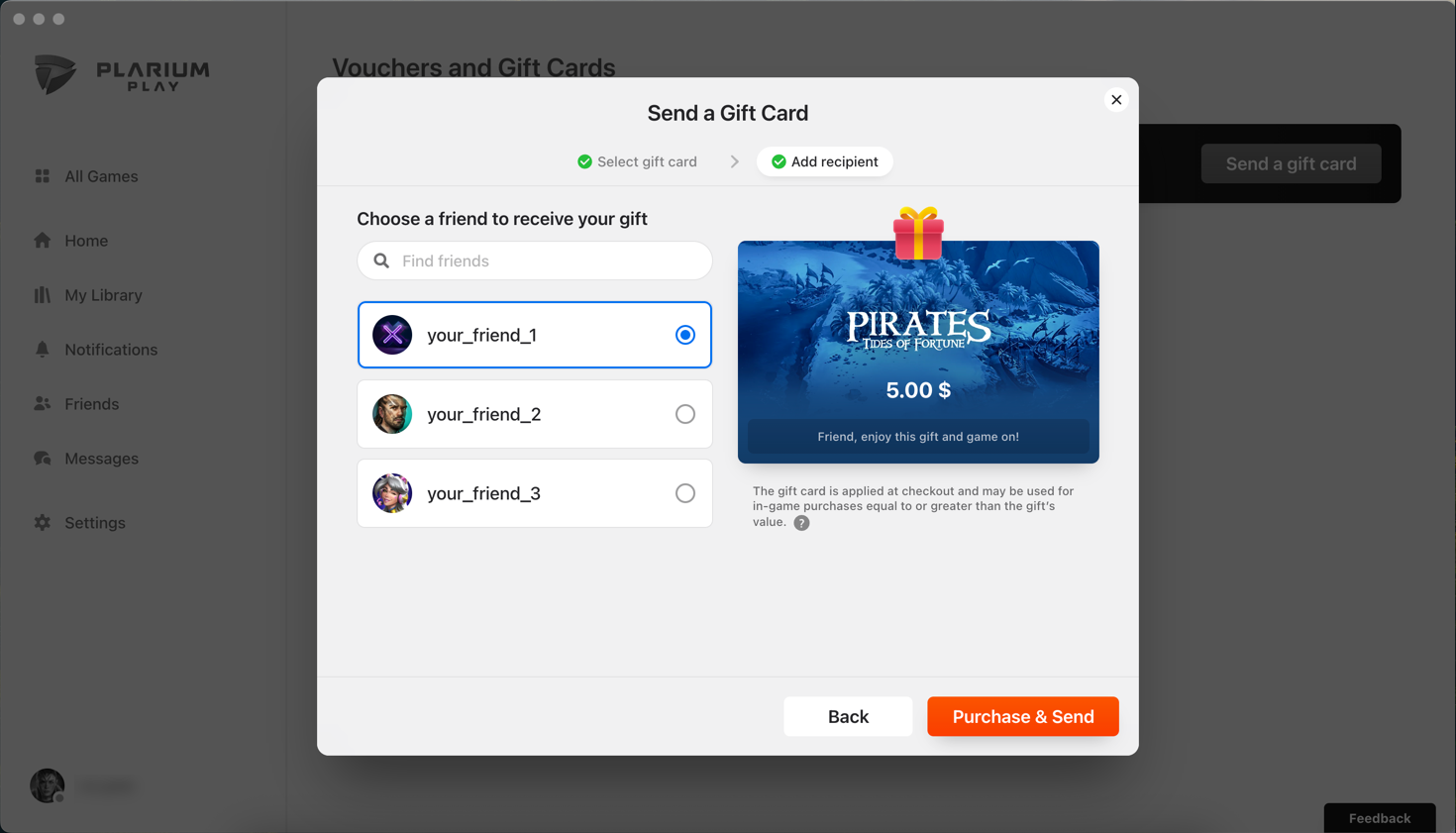 Once you’ve chosen which gift card you want to send, you’ll come to perhaps the toughest part: deciding who should be the lucky recipient! Search through your friends, and then complete your purchase.