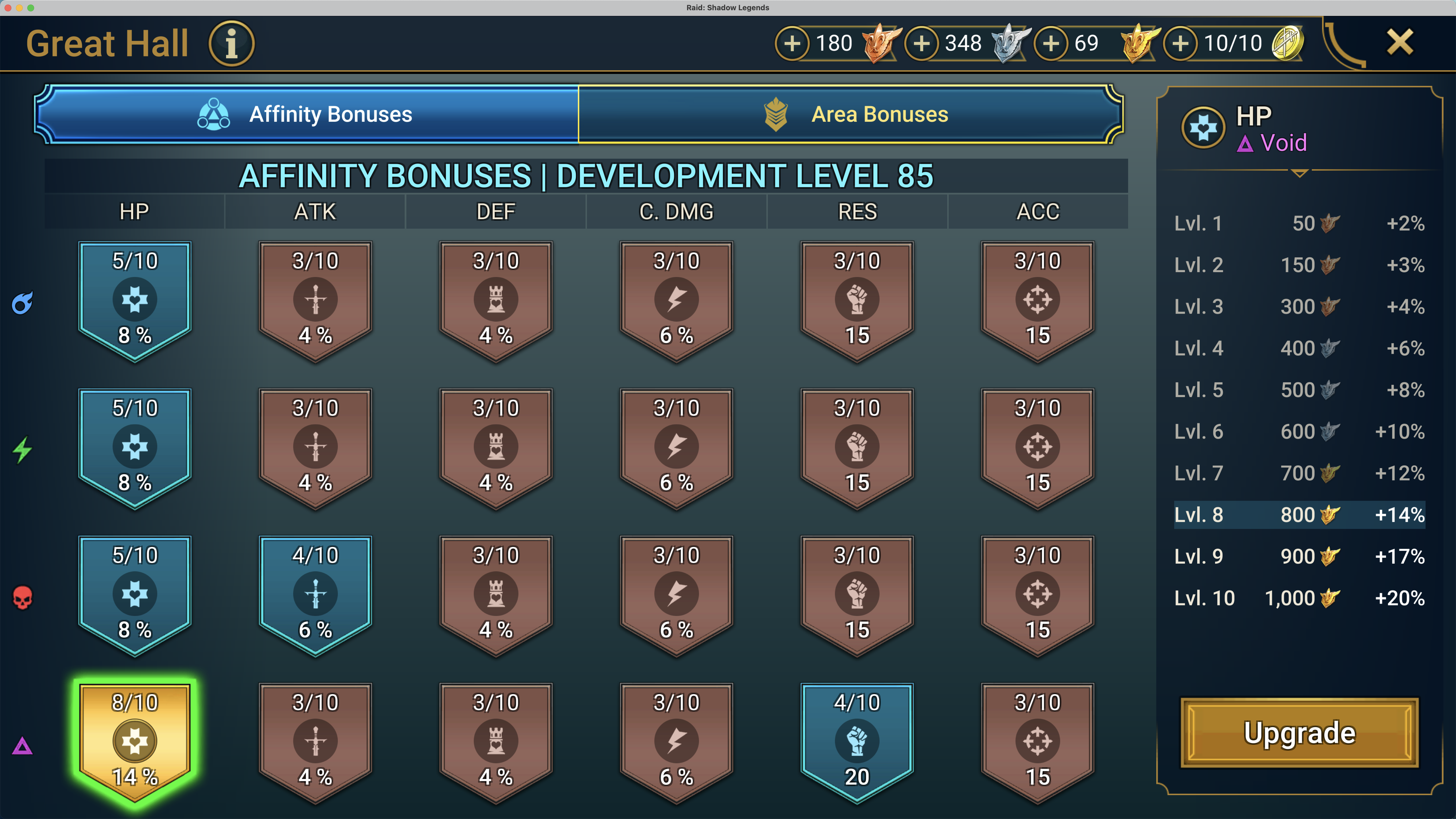 I just upgraded one affinity to Level 8 and it took 800 gold to get there. 800 after I climbed back into the Gold tier...so 800 gold 2 at a time. Took forever.