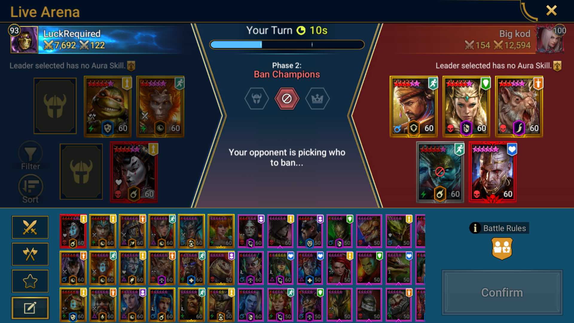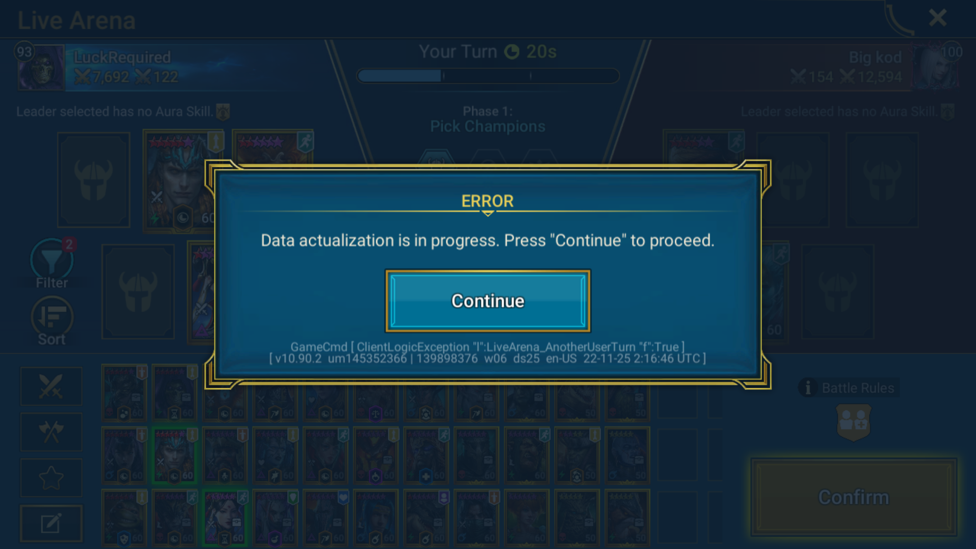 I'm raging, this game just cost me another LA Battle for no reason. I didn't even get to pick my team because the dumb game had a fit. I don't care about blurring names becasue my opponent did nothing wrong also I want them to know what happened and why I was stuck for the entire timer countdown trying to pick a champ and confirm! They probably think I'm one of those timer wasters, thanks Plarium!!