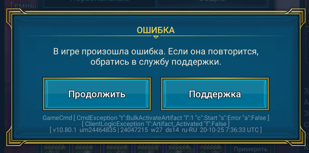 Была собранная сборка на героя, при попытке перенести её на другого персонажа начала появлятся данная ошибка. По отделности артефакты так же не надеваются, та же самая ошибка. Два раза уже писал в саппорт - тишина. Шмот и так с огромным трудом выбивается, так ещё и происходят такие ошибки, которые поддержка не может решить уже две недели