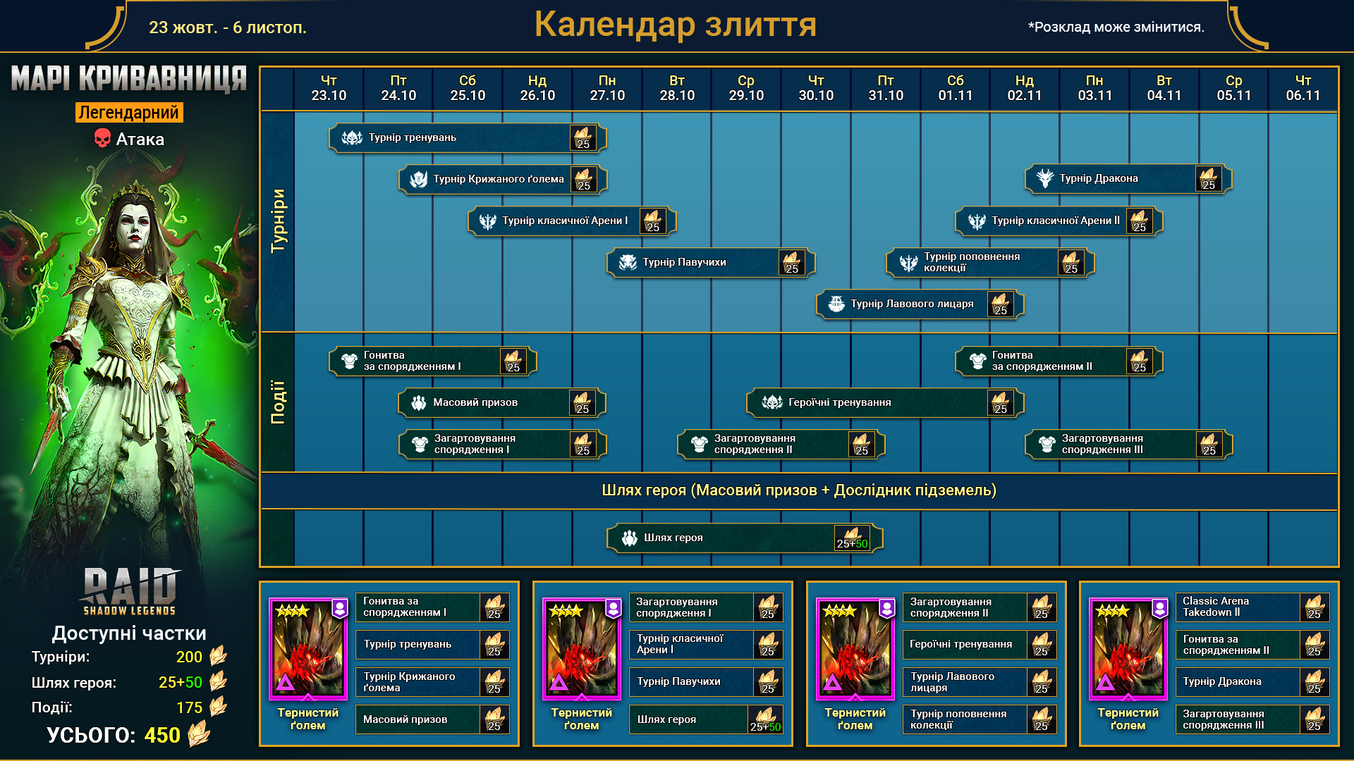 Зокрема ти матимеш змогу взяти участь у новій події злиття. Із 23 жовтня до 6 листопада нова легендарна героїня з фракції Несмертної орди – Марі Кривавниця – буде доступна для злиття в Порталі. Щоб її отримати, тобі знадобляться чотири Тернистих ґолеми.