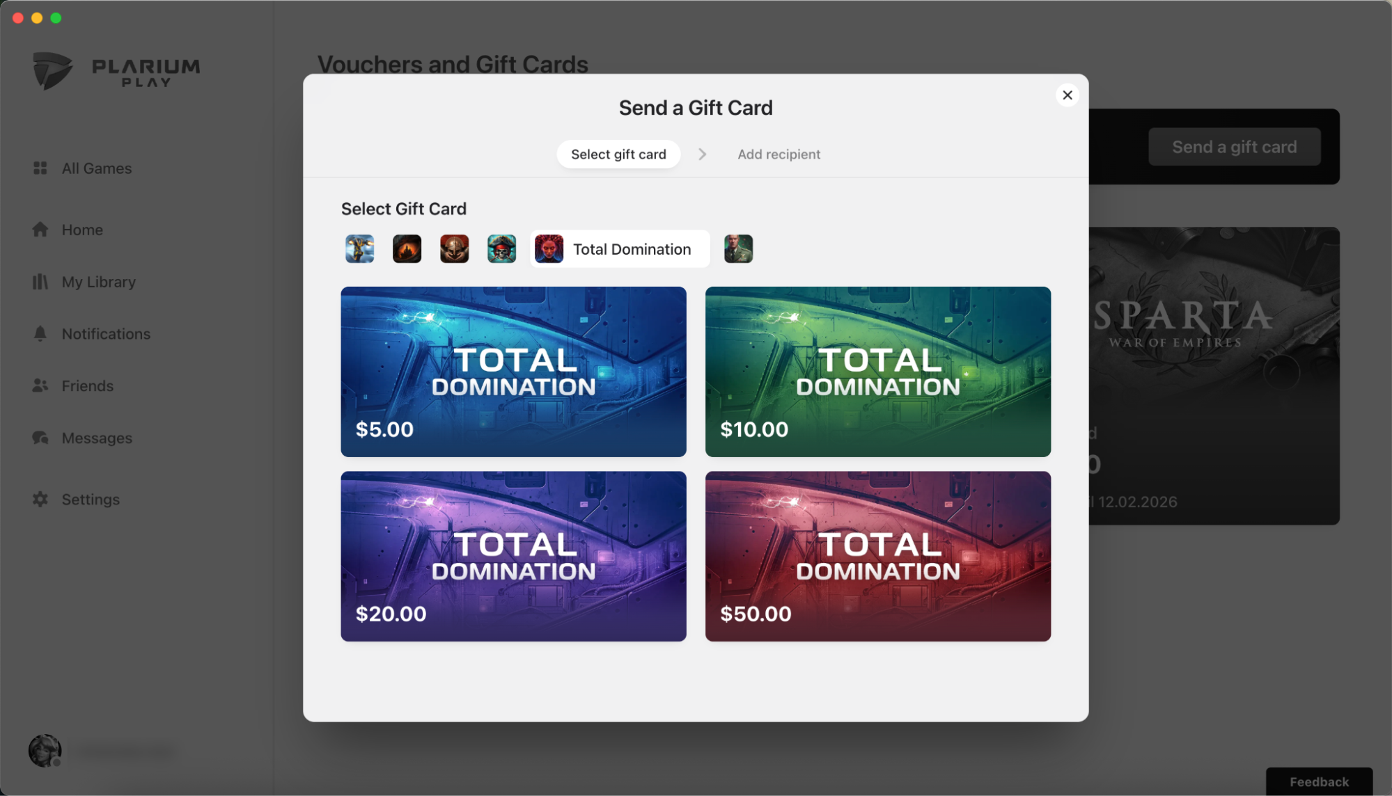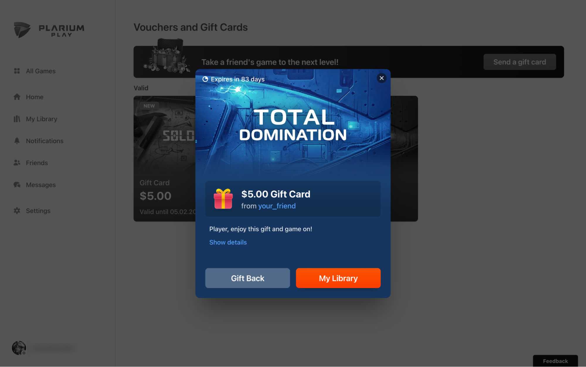 Sending a gift card to a friend to make their day takes just a few steps, with the “Vouchers & Gifts” section of the account menu in Plarium Play as your starting point.